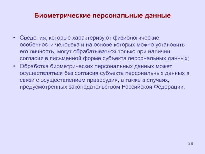 Обработка биометрических персональных данных может осуществляться без согласия субъекта персональных данных в связи с осуществлением правосудия, а также в случаях, предусмотренных законодательством Российской Федерации.