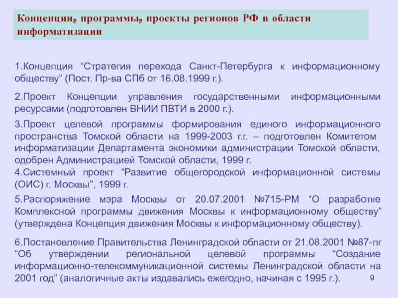 Слайд 91.Концепция “Стратегия перехода Санкт-Петербурга к информационному обществу” (Пост. Пр-ва СПб