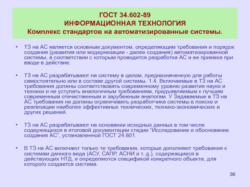 ТЗ на АС разрабатывают на систему в целом, предназначенную для работы самостоятельно или в составе другой системы. 1.4. Включаемые в ТЗ на АС требования должны соответствовать современному уровню развития науки и техники и не уступать аналогичным требованиям, предъявляемым к лучшим современным отечественным и зарубежным аналогам. У Задаваемые в ТЗ на АС требования не должны ограничивать разработчика системы в поиске и реализации наиболее эффективных технических, технико-экономических и других решений.