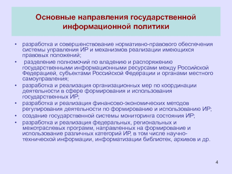 разработка и реализация федеральных, региональных и межотраслевых программ, направленных на формирование и использование различных категорий ИР, в том числе научно-технической информации, информатизации библиотек, архивов и др.
