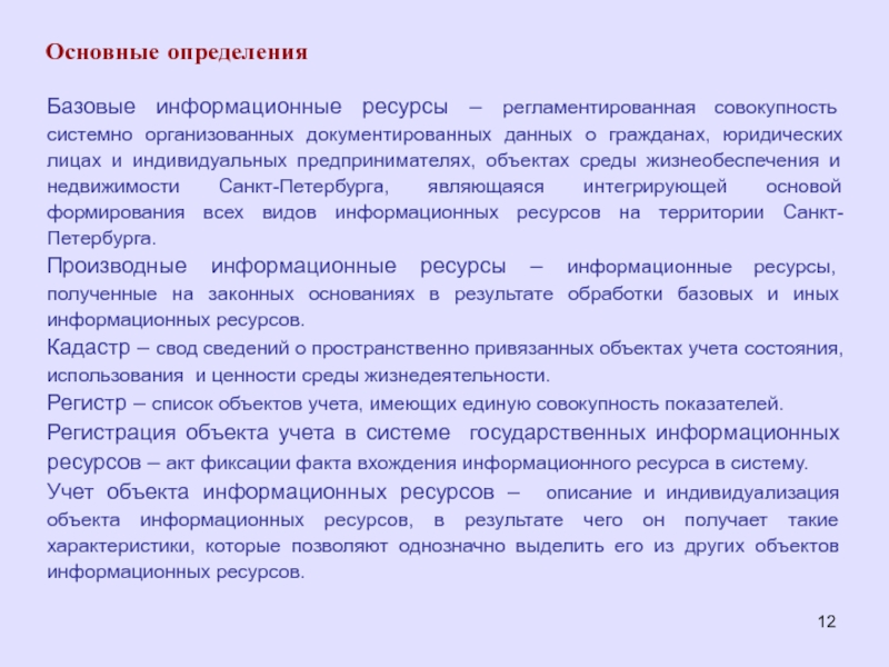 Слайд 12Базовые информационные ресурсы – регламентированная совокупность системно организованных документированных данных