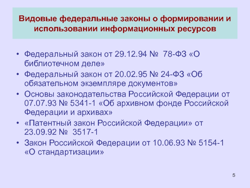Слайд 5Видовые федеральные законы о формировании и использовании информационных ресурсов
