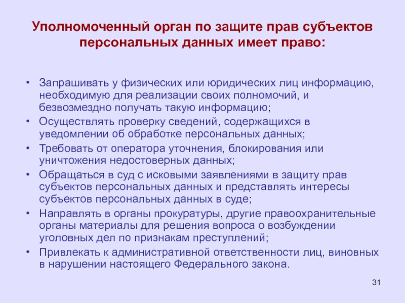 Слайд 31Уполномоченный орган по защите прав субъектов персональных данных имеет право: