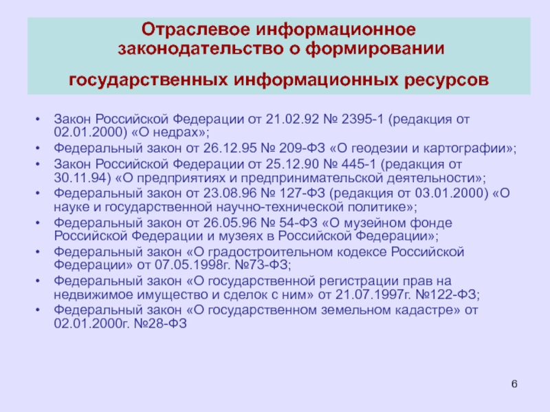 Федерации от 21.02.92 № 2395-1 (редакция от 02.01.2000) «О недрах»;