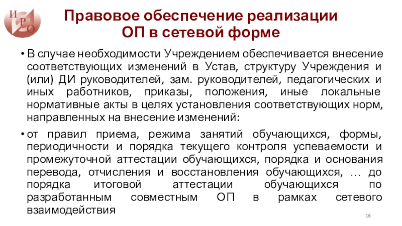от правил приема, режима занятий обучающихся, формы, периодичности и порядка текущего контроля успеваемости и промежуточной аттестации обучающихся, порядка и основания перевода, отчисления и восстановления обучающихся, … до порядка итоговой аттестации обучающихся по разработанным совместным ОП в рамках сетевого взаимодействия