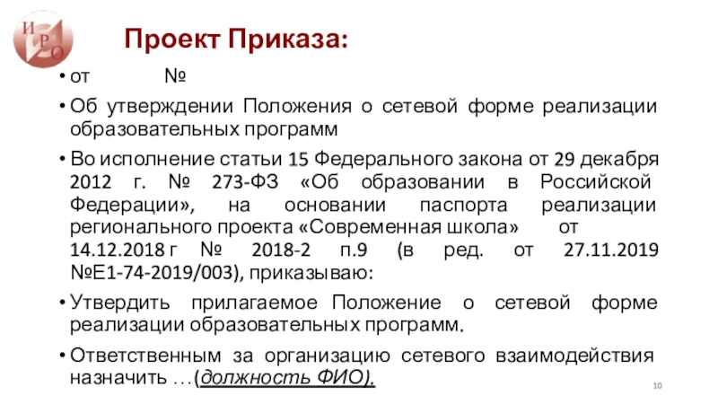 Ответственным за организацию сетевого взаимодействия назначить …(должность ФИО).