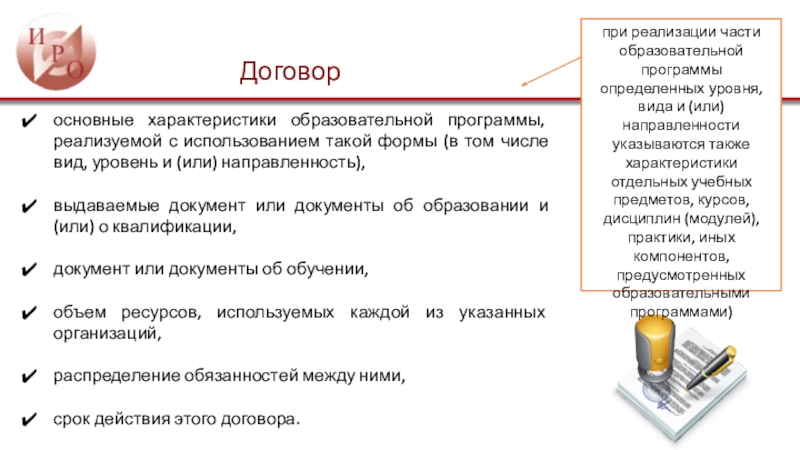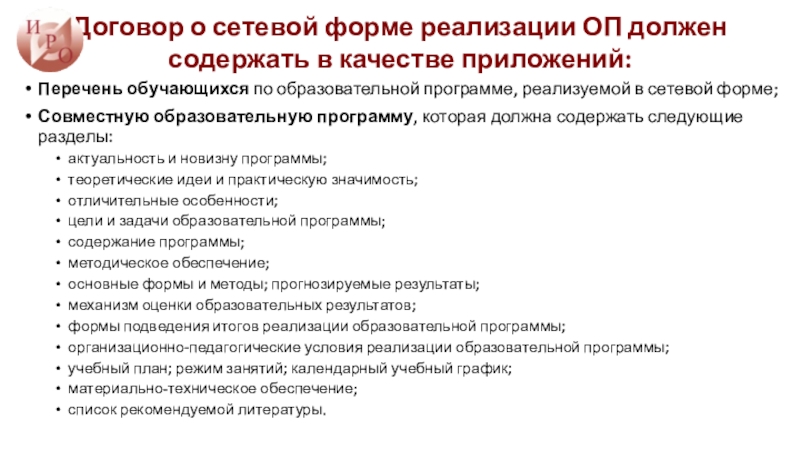 Слайд 7Договор о сетевой форме реализации ОП должен содержать в качестве