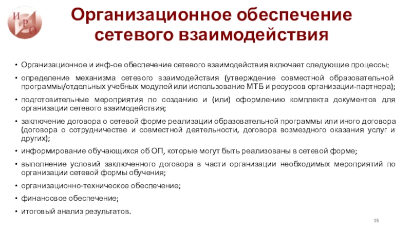 Слайд 15Организационное обеспечение сетевого взаимодействия