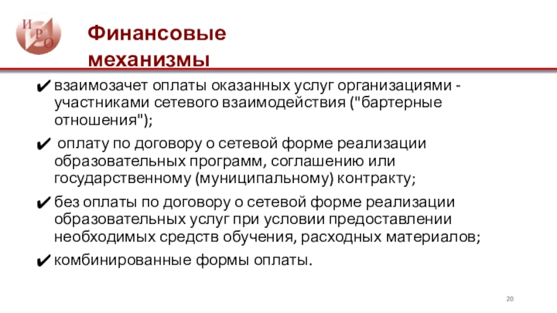 Слайд 20взаимозачет оплаты оказанных услуг организациями - участниками сетевого взаимодействия ("бартерные