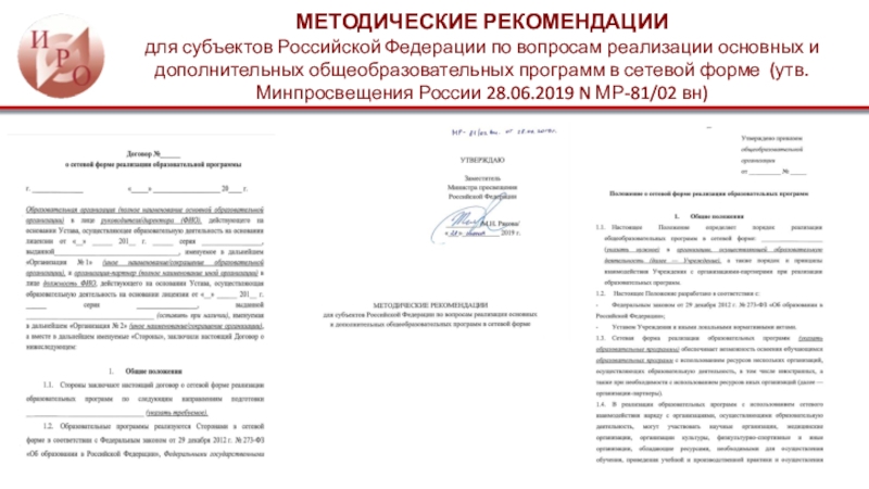 МР для субъектов Российской Федерации по вопросам реализации основных и дополнительных общеобразовательных программ в сетевой форме (утв. Минпросвещения России 28.06.2019 N МР-81/02 вн) https://legalacts.ru/doc/metodicheskie-rekomendatsii-dlja-subektov-rossiiskoi-federatsii-po-voprosam-realizatsii/