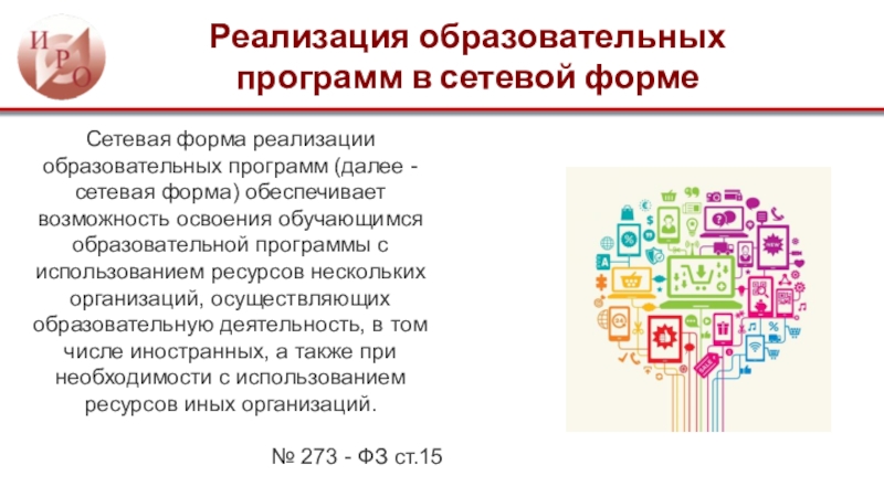 1. Сетевая форма реализации образовательных программ обеспечивает возможность освоения обучающимся образовательной программы и (или) отдельных учебных предметов, курсов, дисциплин (модулей), практики, иных компонентов, предусмотренных образовательными программами (в том числе различных вида, уровня и (или) направленности), с использованием ресурсов нескольких организаций, осуществляющих образовательную деятельность, включая иностранные, а также при необходимости с использованием ресурсов иных организаций.