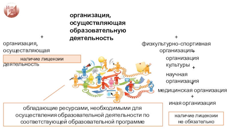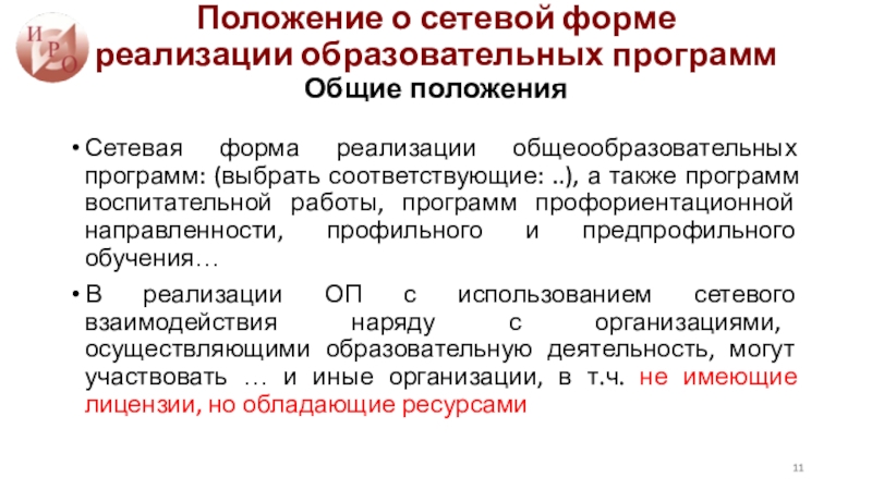 В реализации ОП с использованием сетевого взаимодействия наряду с организациями, осуществляющими образовательную деятельность, могут участвовать … и иные организации, в т.ч. не имеющие лицензии, но обладающие ресурсами