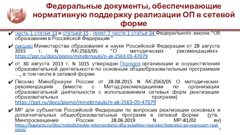 Слайд 22Федеральные документы, обеспечивающие нормативную поддержку реализации ОП в сетевой форме
