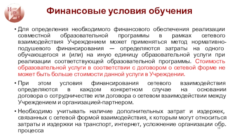 Необходимо учитывать наличие дополнительных затрат и издержек, связанных с сетевой формой взаимодействия, к которым могут относиться затраты и издержки на транспорт, интернет, усложнение организации обр. процесса