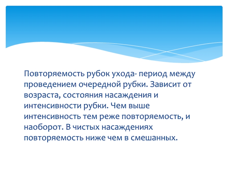Слайд 9Повторяемость рубок ухода- период между проведением очередной рубки. Зависит от