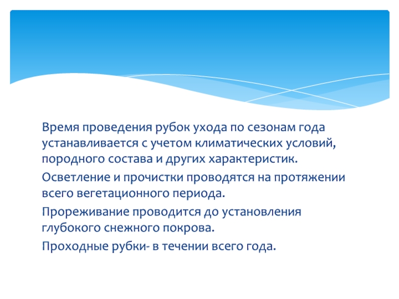 Слайд 6Время проведения рубок ухода по сезонам года устанавливается с учетом