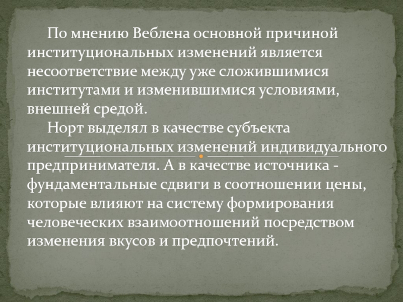 Слайд 17 По мнению Веблена основной причиной институциональных изменений является несоответствие между