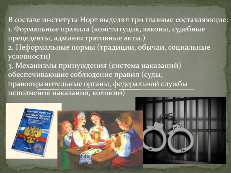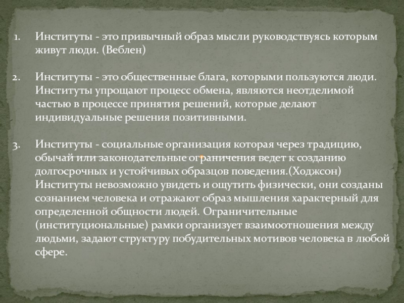 Слайд 3Институты - это привычный образ мысли руководствуясь которым живут люди.