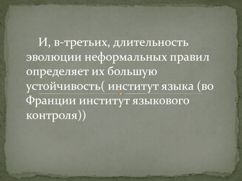 Слайд 14 И, в-третьих, длительность эволюции неформальных правил определяет их большую устойчивость(