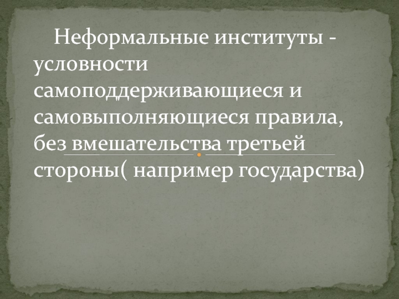 Слайд 9 Неформальные институты - условности самоподдерживающиеся и самовыполняющиеся правила, без вмешательства