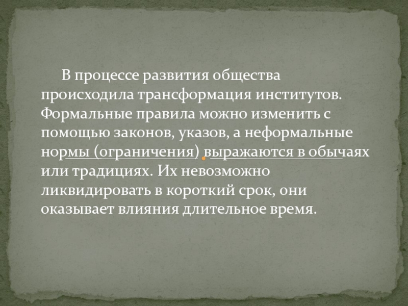 Слайд 16 В процессе развития общества происходила трансформация институтов. Формальные правила можно