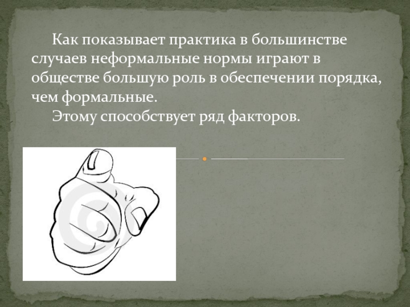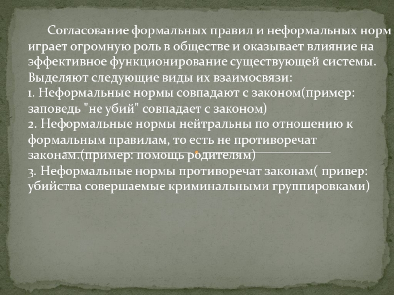Слайд 11 Как показывает практика в большинстве случаев неформальные нормы играют в