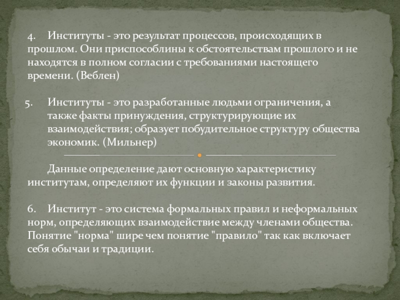 6. Институт - это система формальных правил и неформальных норм, определяющих взаимодействие между членами общества. Понятие "норма" шире чем понятие "правило" так как включает себя обычаи и традиции.