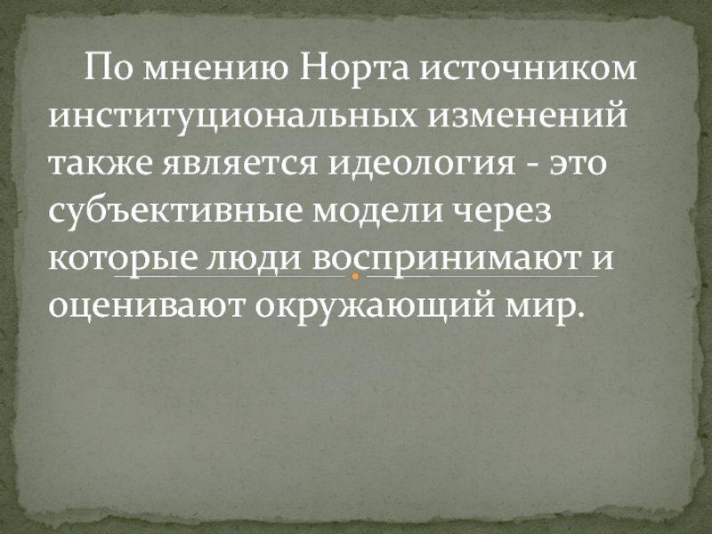 Слайд 18 По мнению Норта источником институциональных изменений также является идеология -