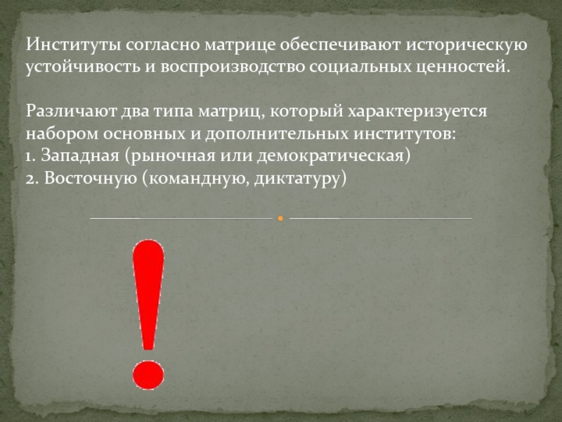 Слайд 6Институты согласно матрице обеспечивают историческую устойчивость и воспроизводство социальных ценностей.