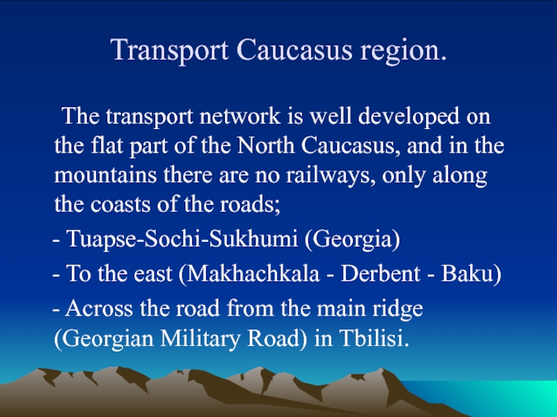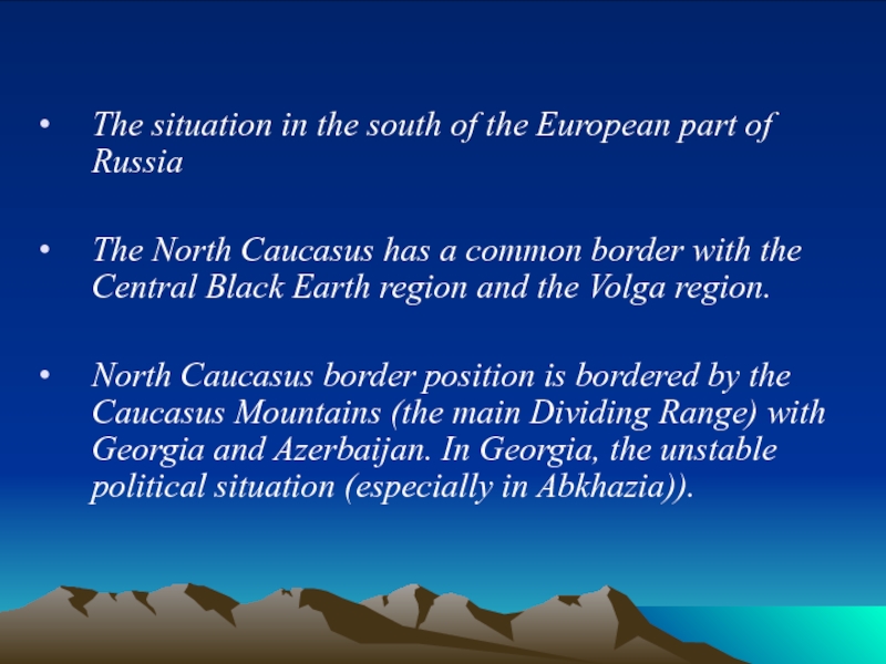 North Caucasus border position is bordered by the Caucasus Mountains (the main Dividing Range) with Georgia and Azerbaijan. In Georgia, the unstable political situation (especially in Abkhazia)).