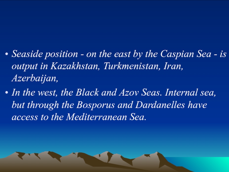 Слайд 4Seaside position - on the east by the Caspian Sea