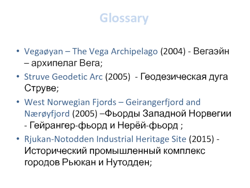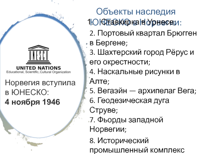 рисунки в Алте; 5. Вегаэйн — архипелаг Вега; 6. Геодезическая дуга Струве; 7. Фьорды западной Норвегии;8. Исторический промышленный комплекс городов Рьюкан и Нутодден;