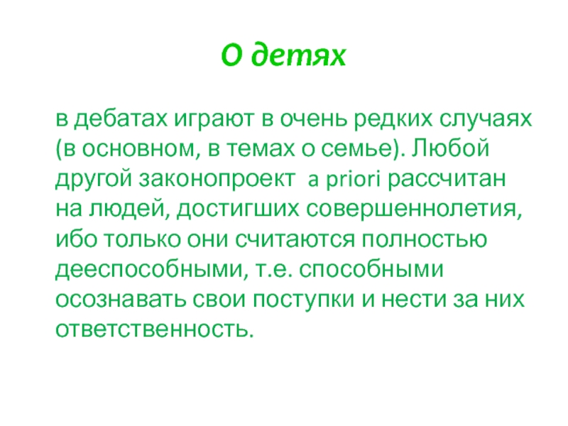 О детяхв дебатах играют в очень редких случаях (в основном, в темах о семье). Любой другой законопроект