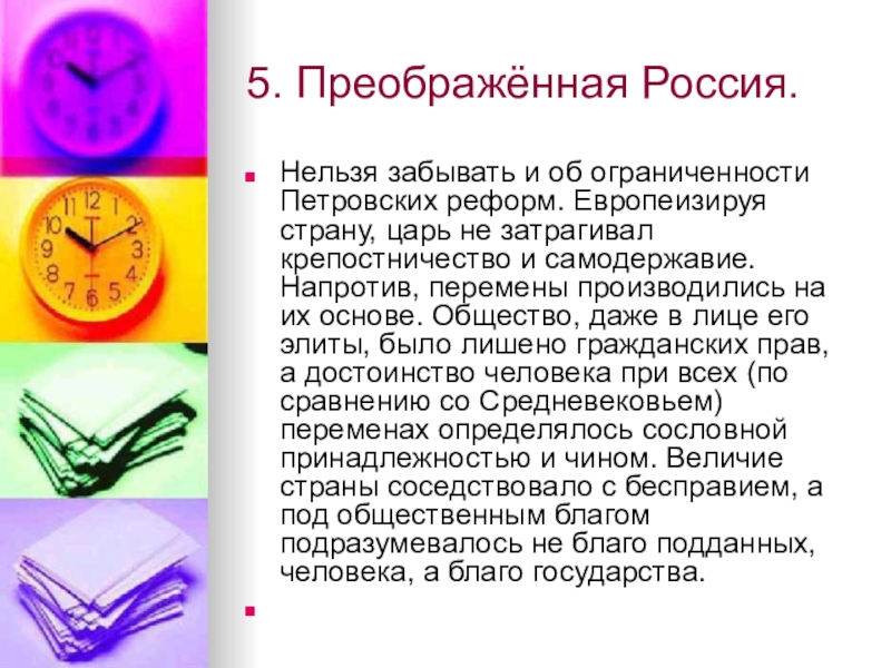 производились на их основе. Общество, даже в лице его элиты, было лишено гражданских прав, а достоинство человека при всех (по сравнению со Средневековьем) переменах определялось сословной принадлежностью и чином. Величие страны соседствовало с бесправием, а под общественным благом подразумевалось не благо подданных, человека, а благо государства.