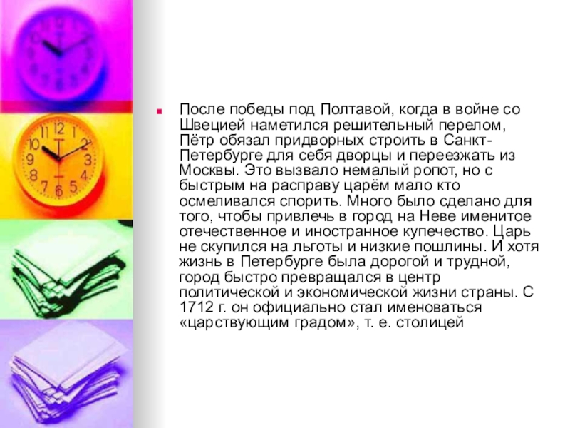 дворцы и переезжать из Москвы. Это вызвало немалый ропот, но с быстрым на расправу царём мало кто осмеливался спорить. Много было сделано для того, чтобы привлечь в город на Неве именитое отечественное и иностранное купечество. Царь не скупился на льготы и низкие пошлины. И хотя жизнь в Петербурге была дорогой и трудной, город быстро превращался в центр политической и экономической жизни страны. С 1712 г. он официально стал именоваться «царствующим градом», т. е. столицей