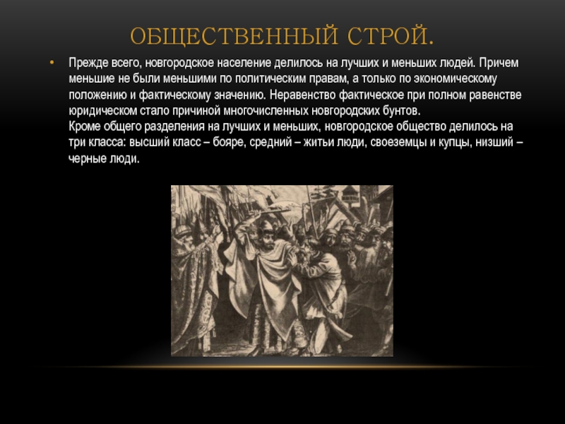 Кроме общего разделения на лучших и меньших, новгородское общество делилось на три класса: высший класс – бояре, средний – житьи люди, своеземцы и купцы, низший – черные люди.