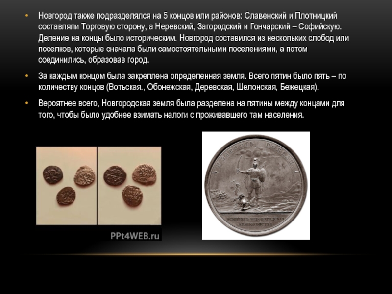 Слайд 7Новгород также подразделялся на 5 концов или районов: Славенский и