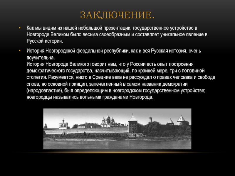 История Новгорода Великого говорит нам, что у России есть опыт построения демократического государства, насчитывающий, по крайней мере, три с половиной столетия. Разумеется, никто в Средние века не рассуждал о правах человека и свободе слова, но основной принцип, запечатленный в самом названии демократии (народовластие), был определяющим в новгородском государственном устройстве; новгородцы назывались вольными гражданами Новгорода.