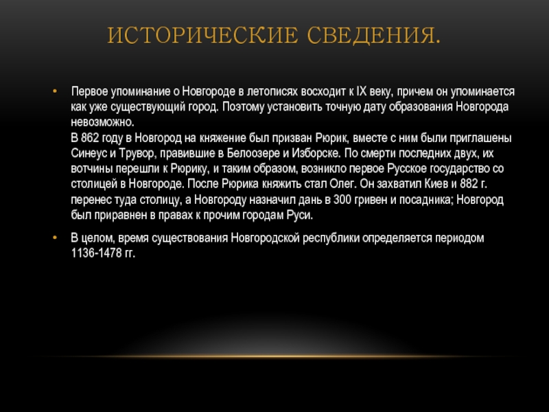 В 862 году в Новгород на княжение был призван Рюрик, вместе с ним были приглашены Синеус и Трувор, правившие в Белоозере и Изборске. По смерти последних двух, их вотчины перешли к Рюрику, и таким образом, возникло первое Русское государство со столицей в Новгороде. После Рюрика княжить стал Олег. Он захватил Киев и 882 г. перенес туда столицу, а Новгороду назначил дань в 300 гривен и посадника; Новгород был приравнен в правах к прочим городам Руси.