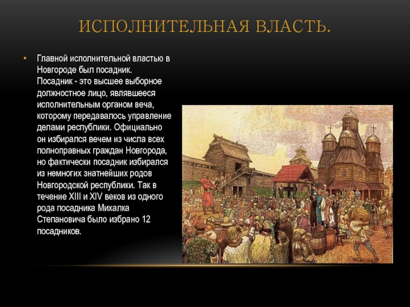 управление делами республики. Официально он избирался вечем из числа всех полноправных граждан Новгорода, но фактически посадник избирался из немногих знатнейших родов Новгородской республики. Так в течение XIII и XIV веков из одного рода посадника Михалка Степановича было избрано 12 посадников.