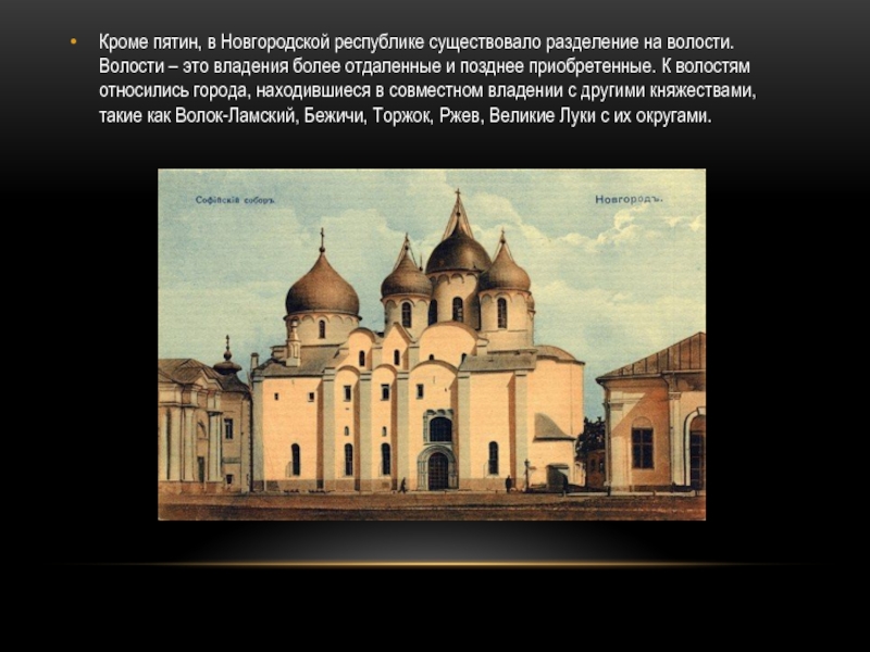 Слайд 8Кроме пятин, в Новгородской республике существовало разделение на волости. Волости