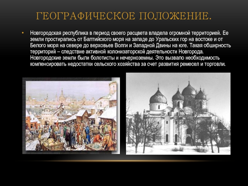гор на востоке и от Белого моря на севере до верховьев Волги и Западной Двины на юге. Такая обширность территорий – следствие активной колонизаторской деятельности Новгорода. Новгородские земли были болотисты и нечерноземны. Это вызвало необходимость компенсировать недостатки сельского хозяйства за счет развития ремесел и торговли.
