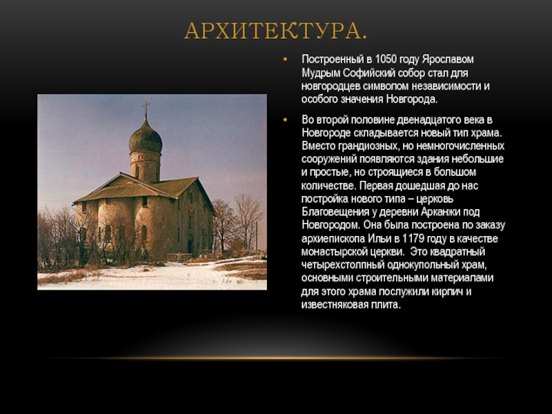 века в Новгороде складывается новый тип храма. Вместо грандиозных, но немногочисленных сооружений появляются здания небольшие и простые, но строящиеся в большом количестве. Первая дошедшая до нас постройка нового типа – церковь Благовещения у деревни Арканжи под Новгородом. Она была построена по заказу архиепископа Ильи в 1179 году в качестве монастырской церкви. Это квадратный четырехстолпный однокупольный храм, основными строительными материалами для этого храма послужили кирпич и известняковая плита.