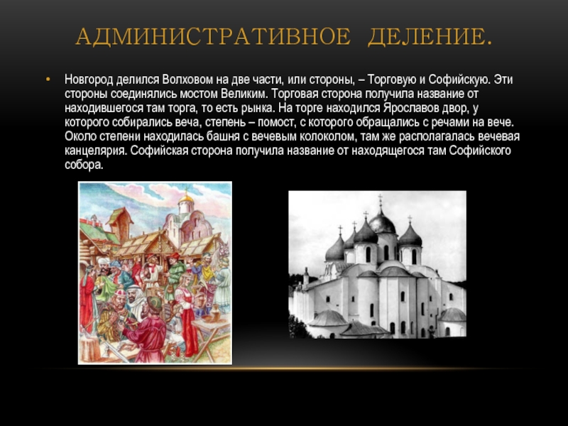 получила название от находившегося там торга, то есть рынка. На торге находился Ярославов двор, у которого собирались веча, степень – помост, с которого обращались с речами на вече. Около степени находилась башня с вечевым колоколом, там же располагалась вечевая канцелярия. Софийская сторона получила название от находящегося там Софийского собора.