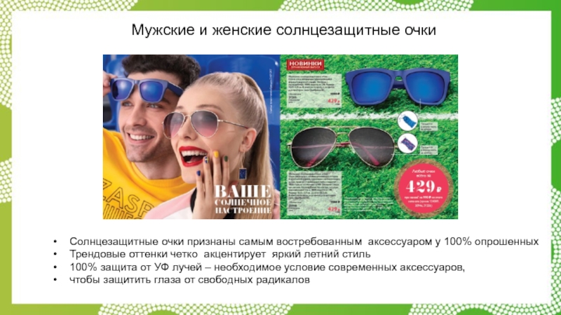Слайд 33Мужские и женские солнцезащитные очки