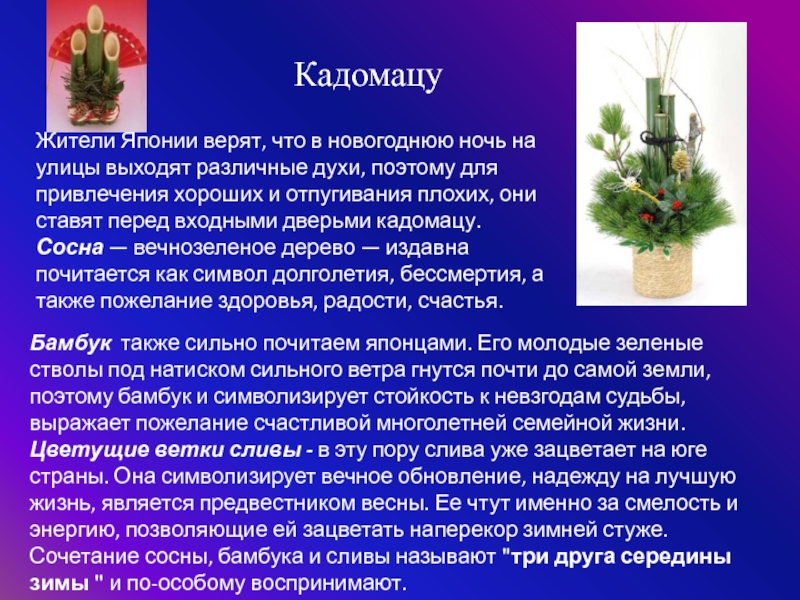 Сочетание сосны, бамбука и сливы называют "три друга середины зимы " и по-особому воспринимают.