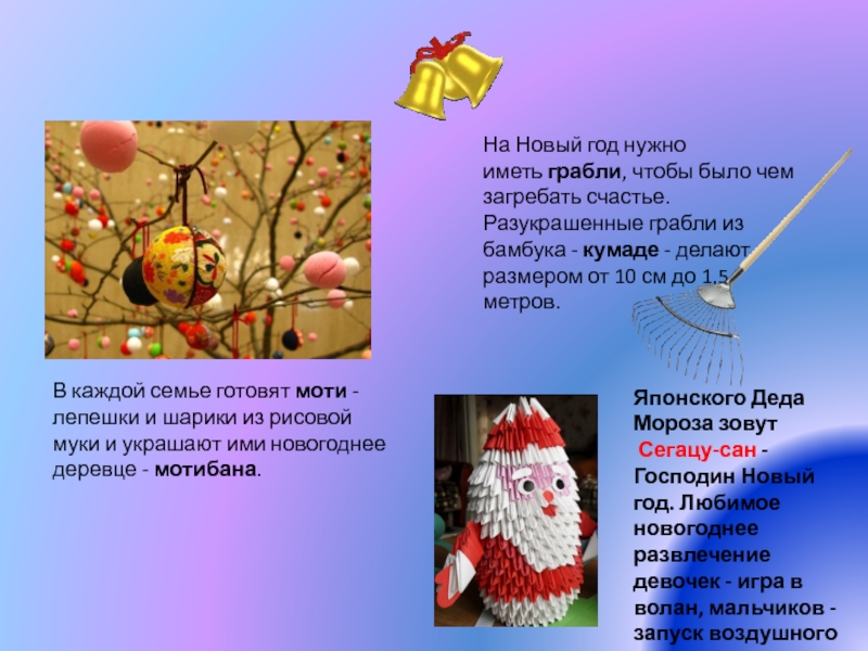 В каждой семье готовят моти - лепешки и шарики из рисовой муки и украшают ими новогоднее деревце - мотибана.