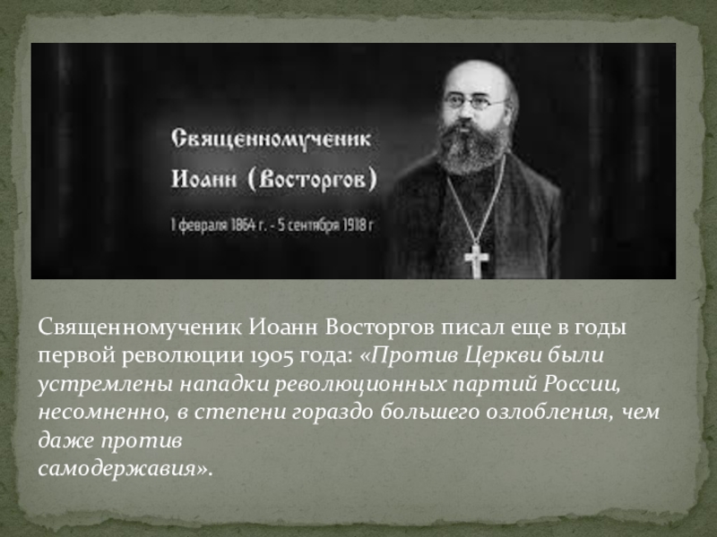 Слайд 5Священномученик Иоанн Восторгов писал еще в годы первой революции 1905