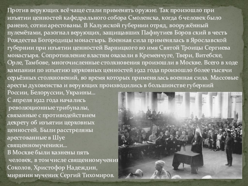 пулемётами, разогнал верующих, защищавших Пафнутиев Боров ский в честь Рождества Богородицы монастырь. Военная сила применялась в Ярославской губернии при изъятии ценностей Варницкого во имя Святой Троицы Сергиева монастыря. Сопротивление властям оказали в Кременчуге, Твери, Витебске,