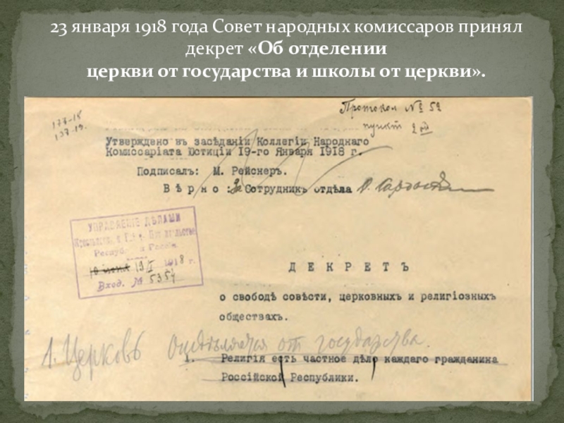 Слайд 823 января 1918 года Совет народных комиссаров принял декрет «Об